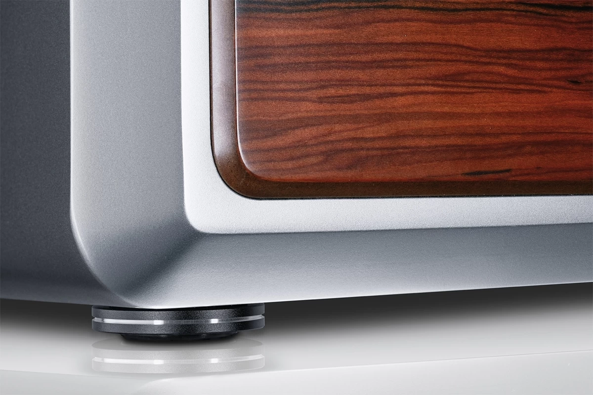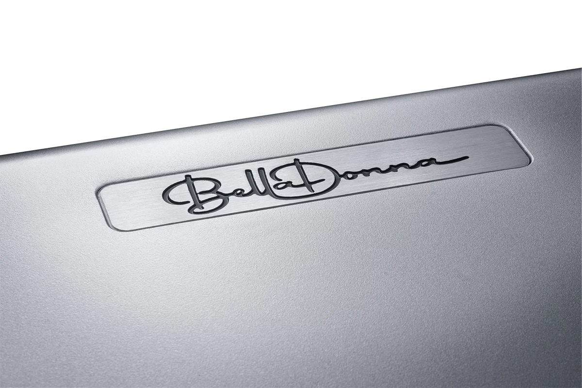 It goes without saying that when we build a speaker which eclipses everything in its segment, it also needs to look good. It all starts with the colors used. The "Iced Silver" silk matt lacquer finish is both subtle and yet visible in its own way. Side elements consisting of cherry wood contrast the overall appearance. The name "Bella Donna" is milled on the top of the speaker. The beveled front panel is not only for visual benefit, as it also ensures particularly good internal acoustic conditions.