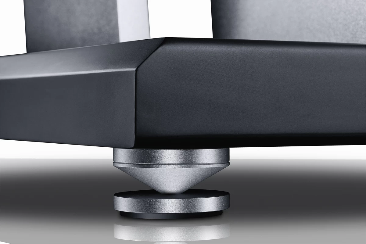- Height-adjustable solid metal spikes with floor-friendly, damped solid metal pads