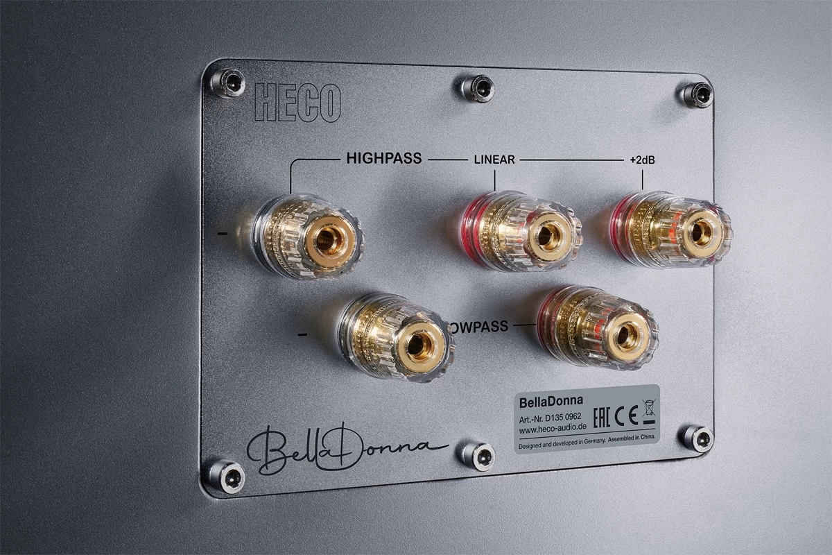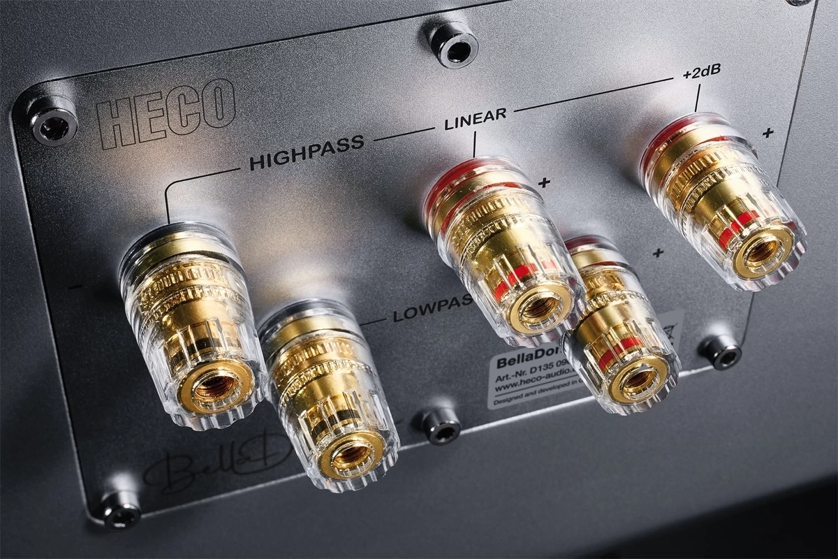 In addition to the audiophile chassis, there is also a crossover inside that fulfills the highest standards. Selected components, including exclusive high-quality film capacitors, have been combined in such a way to ensure the signals arrive at the chassis in a phase-optimized manner. If you really want to get the most out of the Bella Donna with different cables or amplifiers, you can do so easily thanks to the solid bi-wiring terminals. The additional connection at the rear of the speaker provides you with the ability to increase the treble by 2 dB to compensate for room acoustics - without having to resort to any electronic aids.