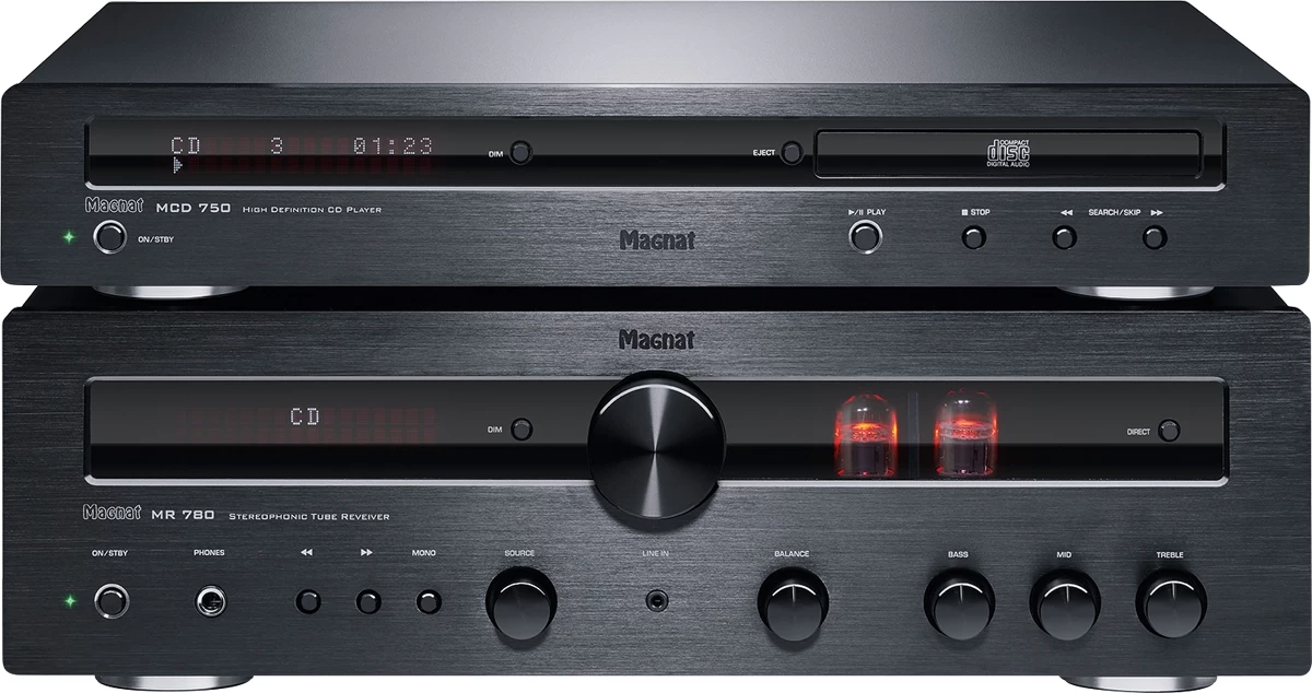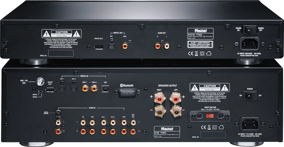 The Magnat MR 780 combines elegantly audiophile hi-fi sound with substantial power reserves: Used in the pre-amp stage are high-quality selected and extensively burnt-in ECC 81 valves, ensuring that well-loved, warm sound. The output stage relies on a low-emission toroidal transformer and provides an impressive 100 watts of RMS power per channel at 4 ohms. Added to this is a virtually overwhelming range of connection options for analogue and digital sources, including Bluetooth aptX. Where necessary, a high-quality Wolfson D/A converter takes care of the signal transformation with up to 192 kHz and 24 bits. A phono pre-amplifier for MM systems, an integrated DAB/DAB+ tuner as well as an FM receiver and a large number of further details make the MR 780 one of the best stereo receivers in this price category. This high standard is clear from the very first glimpse. You can see immediately from the full-metal enclosure with its solid, brushed aluminium front panel that this unit belongs in the high-end range.