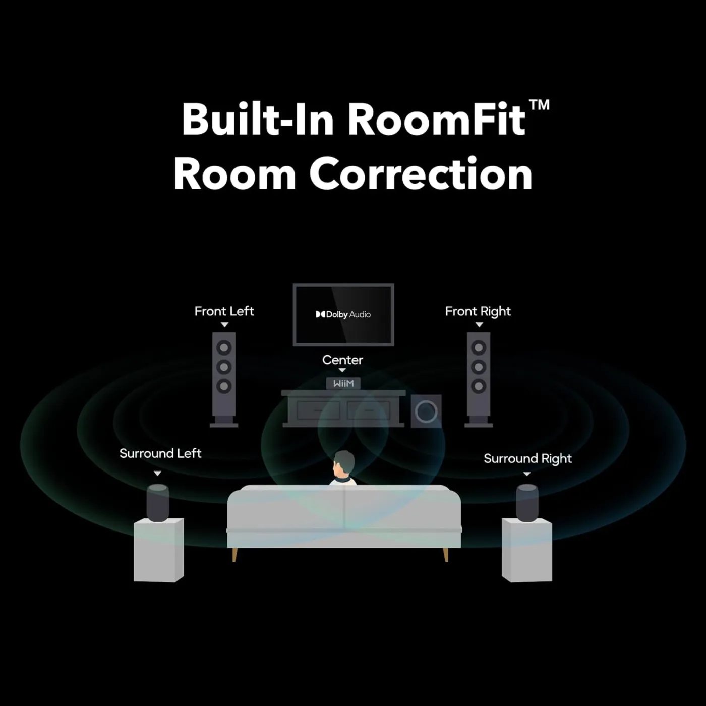 - Built-In RoomFit Room Correction – Auto-calibrates sound based on your room and speakers for a personalized, perfectly balanced listening experience.