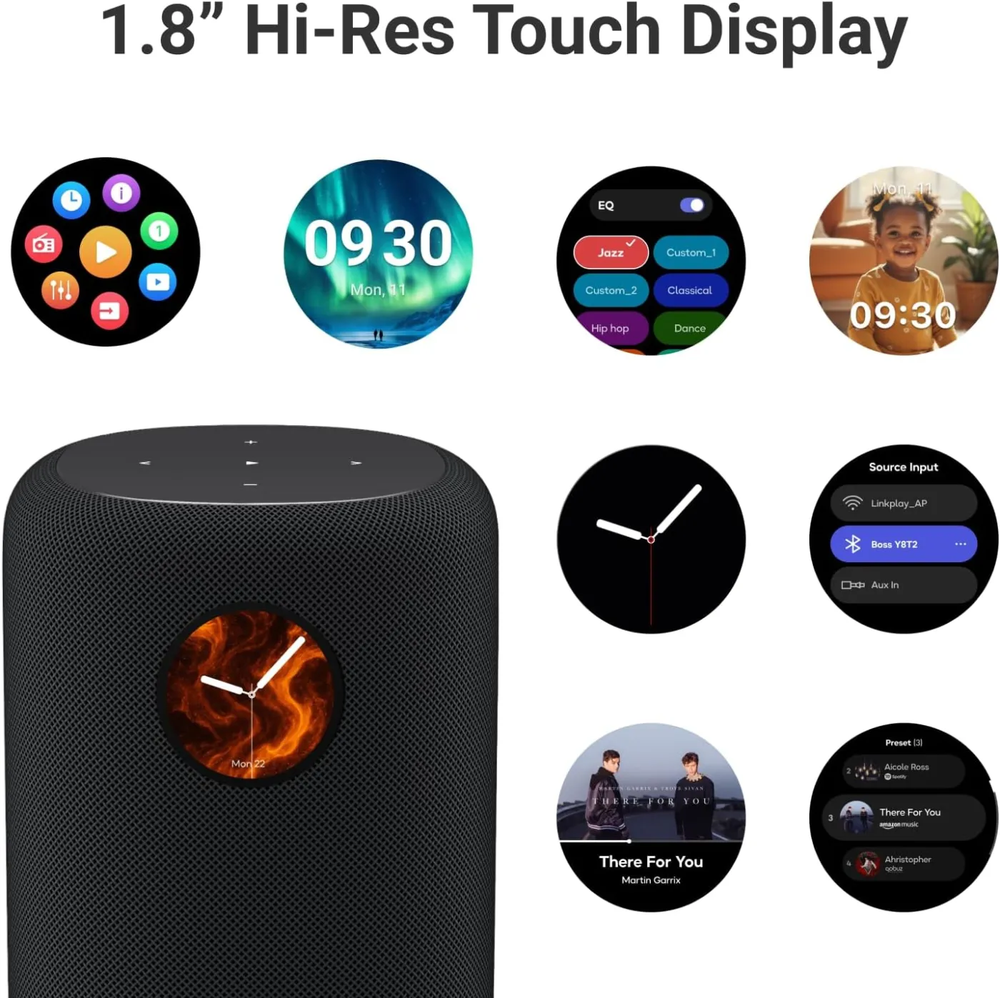- Touch what you hear - 1.8″ round display shows album art, time, track info and gives instant control—play/pause, skip, sources, Quick EQ, presets—no phone required.