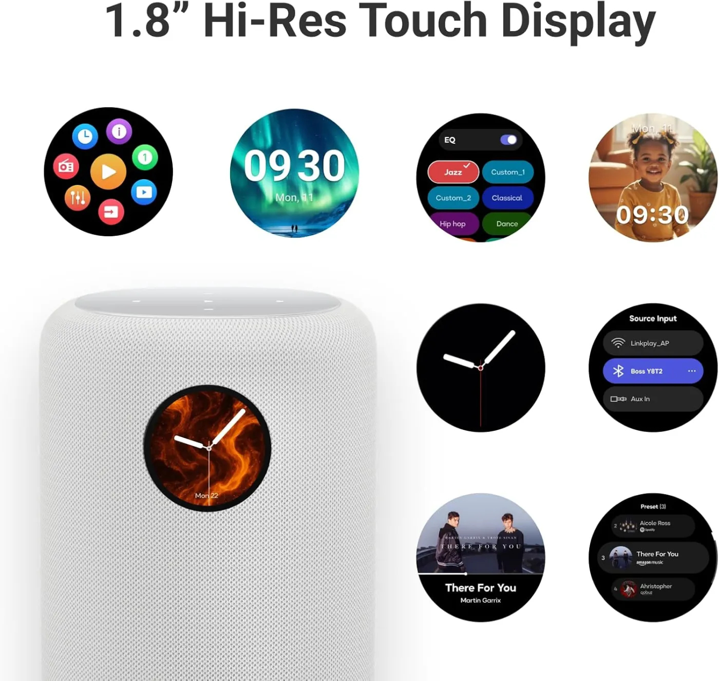 - Touch what you hear - 1.8″ round display shows album art, time, track info and gives instant control—play/pause, skip, sources, Quick EQ, presets—no phone required.