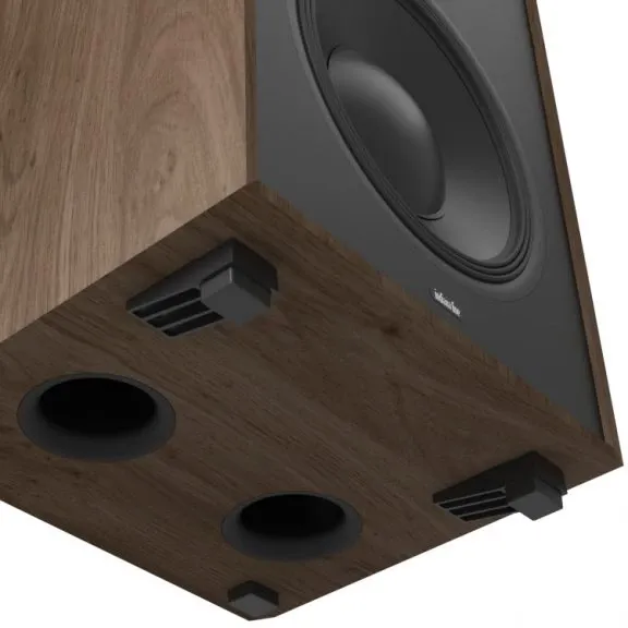 The Utah 8’s prodigious low-frequency capability also owes much to a carefully tuned bass-reflex system with two down-firing ports in the base (each 75 mm in diameter). This exploits floor coupling to reinforce bass energy. Working with the 12-inch woofer in a generous 66-litre enclosure, the system operates free from audible turbulence or compression. The cabinet sits securely on four rubber-damped feet that mechanically decouple it from the floor and allow the reflex alignment to function efficiently at a 30 Hz tuning frequency.