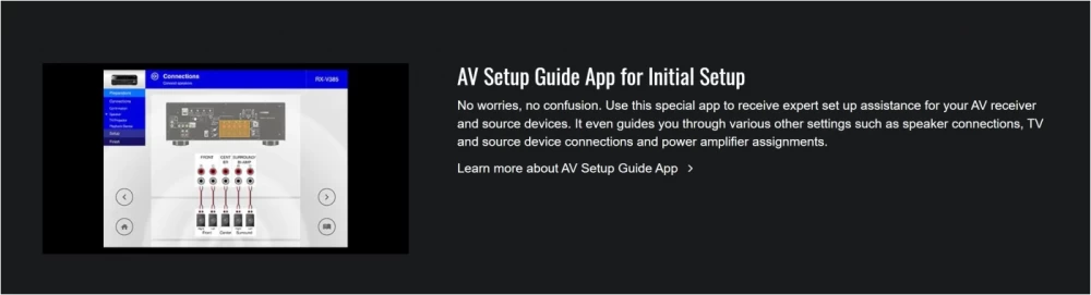 Calibrates sound to your room by analyzing room acoustics and measuring speaker characteristics. This feature also optimizes sound parameters for maximum performance from CINEMA DSP, Dolby Atmos®, DTS:X®.