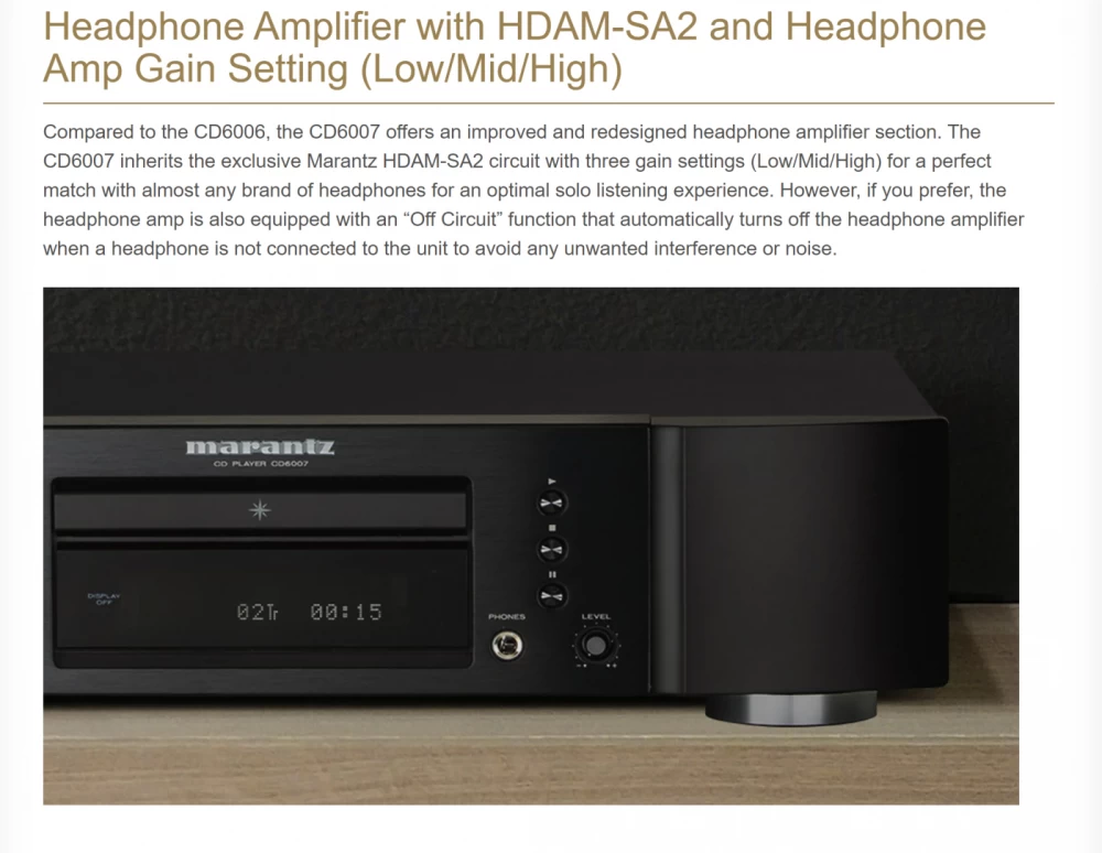 Improving upon the award-winning CD6006, the finely-tuned CD6007 CD Player offers even more specially-selected components and an enhanced circuit layout. Rigid feet further eliminate unwanted vibration while the oversized low noise power supply feeds the digital and analogue circuitry of the player. The new, high-quality AK4490 DAC along with 2 selectable filter options converts digital signals to analogue, this is then ‘pushed’ to the gold-plated synch outputs by Marantz’s proprietary small signal amplifier, the HDAM-SA2. In addition, we have included a new remote that also controls the fitting PM6007 amplifier. The CD6007 features a newly-developed, sophisticated headphone amplifier with a headphone amp gain setting to accommodate a wide range of headphones.