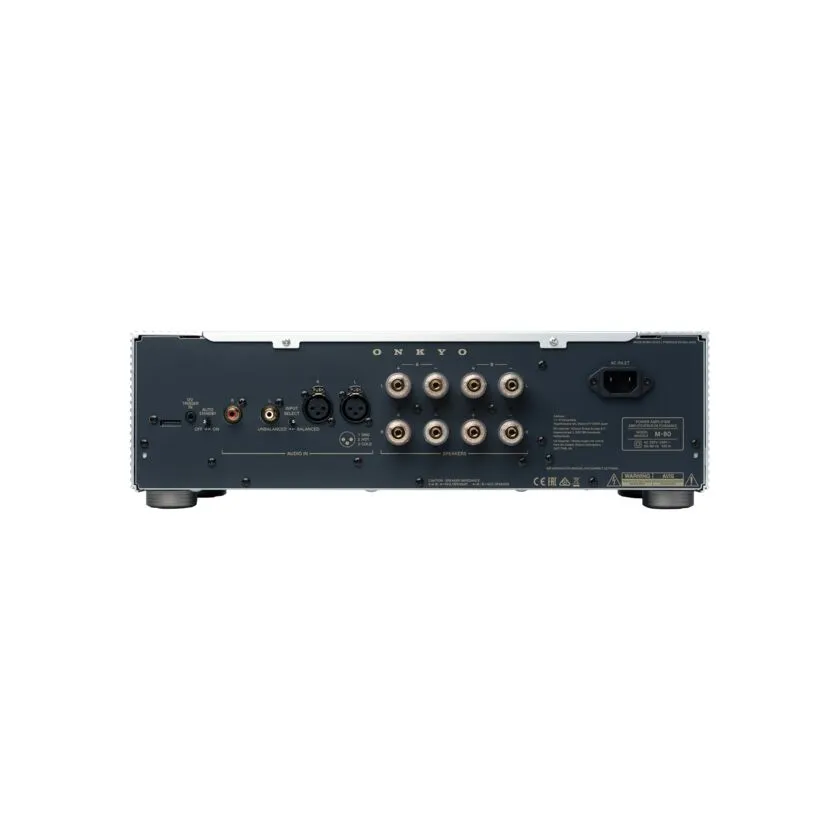 The Onkyo M-80 Power Amplifier features custom high current power supply to provide, dynamic full-range sound, and an extrusion aluminum heat sink that suppresses vibration. The addition of high-quality 10000uF capacitors custom-made exclusively for Onkyo, Hi-Fi grade terminals (both speaker output and audio input terminals), copper bus bars, and a robust vibration-proof front panel ensure powerful, world-class playback.