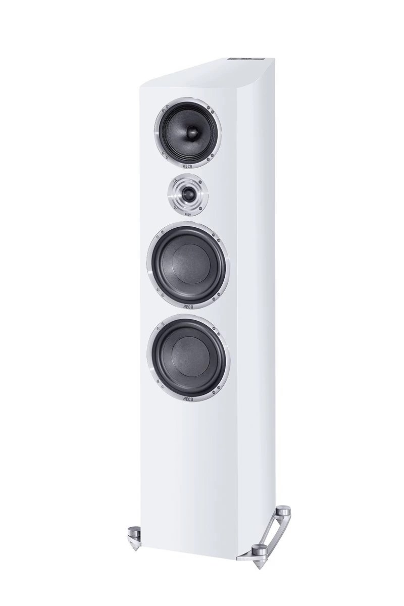 Large state-of-the-art floorstanding speaker with outstanding acoustic properties. Eye-catching features of the largest floorstanding speaker in the series include its angled top and solid aluminum struts, which provide a broad base for a secure footing. Height-adjustable metal spikes ensure the speaker is positioned at a perfect distance from the ground, thereby paving the way for an unadulterated high-end listening experience. The bass and mid-range frequencies are catered for by two 200 mm woofers and a 170 mm midrange driver with tried and tested HECO kraft paper cones, which are renowned for their audiophile sound characteristics and high level stability. The newly developed Fluktus tweeter, which features a computer-optimized multi-wave front panel and 30 mm PFC dome, reproduces its entire frequency spectrum with very natural tones and without any form of exaggeration.