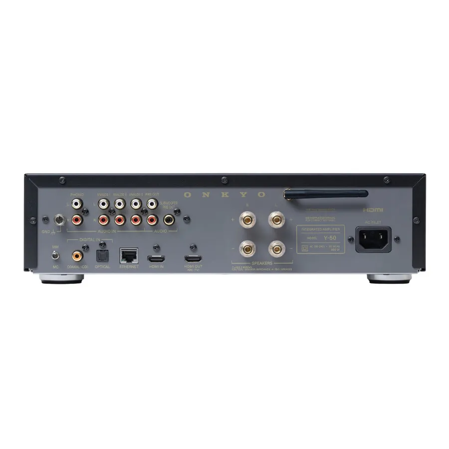 Featuring a host of audio connections, the Onkyo Muse Y-50 sports three pairs of analog RCA inputs, a COAX input, a phono input (MM/MC compatible), and an HDMI/HDMI ARC input and HDMI output for video and gaming sound. It supports Ethernet and WiFi, enabling superior streaming playback. The Y-50 also features proprietary Onkyo Room EQ room calibration designed specifically for the Muse Series – measuring your listening environment and optimizing your sound field for the best experience.